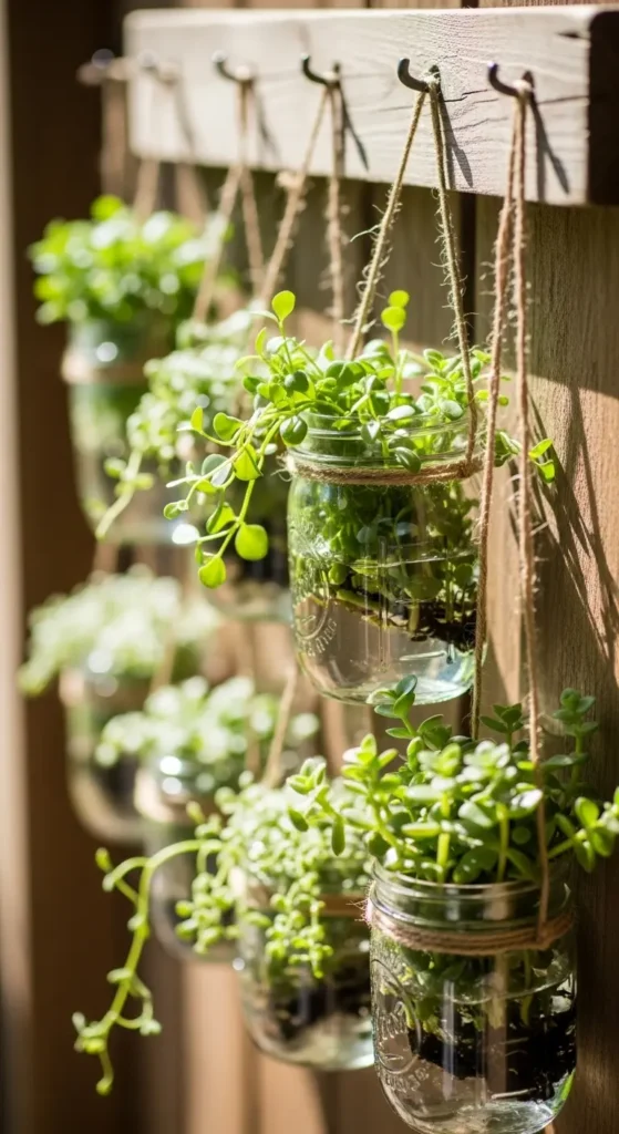 Have some old mason jars lying around? Turn them into charming DIY hanging planters! All you need is twine, a board, and a bit of effort.